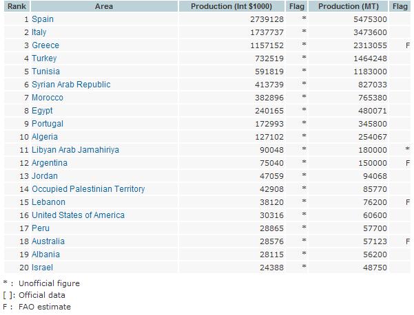 svjetskoj ljestvici drugoplasirana Italija (podaci u tablici). Deset najvećih proizvođaća na svijetu nosi otprilike 95% svjetske proizvodnje. Španjolska tako kao prva u svijetu uprihodi od maslina 2,7 milijardi USD, dok je Hrvatska sa 18 milijuna USD na 22. mjestu ili za tri mjesta lošija npr. od jedne Albanije. Po prihodima su masline u nas tek četrnaesta poljoprivredna kultura dok je mlijeko još uvijek na uvjerljivom prvom mjestu, a nakon njega slijedi pšenica, pa grožđe. To je sve prema FAO koji bilježi rast uzgoja maslina u svijetu za negdje više od tri puta u posljednjih pedeset godina. Da li je tako i kod nas u Hrvatskoj? Kako je u Lumbardi?!