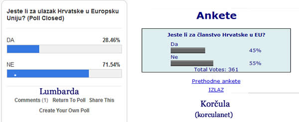 Dakle zatvorili smo anketu, jer danas ide službeni dio. Glasalo je 130 ljudi i što je zanimljivo baš negdje tri puta manje nego na susjednom korculanet-u. Sve nekako u skladu sa veličinom sredine. Dok je grad glasao 45% DA i 55% Ne, selo je reklo 71,5% NE i 28,5% DA. Zanimljivo u svakom pogledu, a biti će zanimljivije vjerojatno kada i dođu službeni rezultati nakon današnjeg izjašnjavanja. Zasigurno će biti seciranja i socioloških analiza. Toliko o tome za sada.