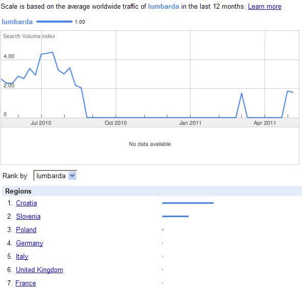 Termin Lumbarda ipak je još relativno rijedak u pretraživanjima no trend googlanja lumbarde pojačava se baš negdje u ovo vrijeme kada bi trebao rasti i broj upita, a brojnost upita koje google ipak ne zna možda provjerimo kroz neku skoru anketu.