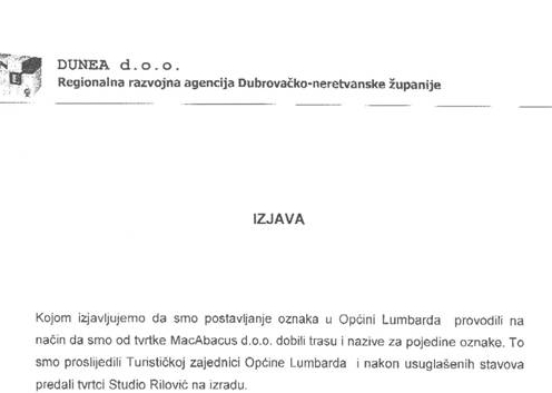 DUNEA je postavila i platila table uz pribavljenu suglasnost TZ Lumbarda.