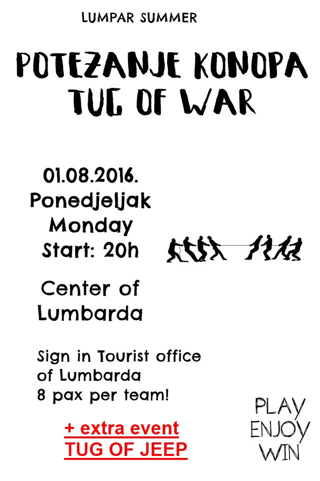 Tradicionalno potezanje konopa u Lumbardi, 1.8.2016. u centru mista, a ove godine i bonus događanje na istu temu, potezanje jeep-ova. Više informacija sutra na samom događanju... … [Continue reading]