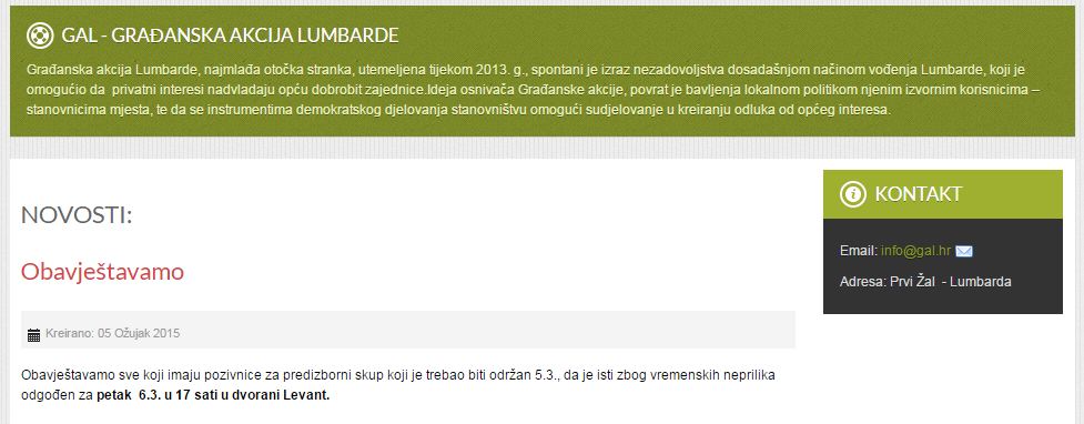 Obavijest o predizbornom skupu GAL-a Predizborni skup Građanske akcije Lumbarda na kojem je gost trebao bit dr. Božo Petrov, gradonačelnik Metkovića, a koji jučer nije održan zbog vremenskih neprilika i prekinute trajektne veze trebao se održati … [Continue reading]