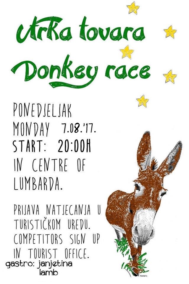 U ponedjeljak 7.8.2017 druga ovogodišnja utrka tovara. Liga za borbu protiv raka prikupljat će donacije nudeći tradicionalnu slasticu, po lumbarajski pršurate. Odazovite se, zabavite se, tu je standardna gastro ponuda, janjetina s ražnja, te se zasladite i pomognite donacijom Ligu za borbu protiv raka.